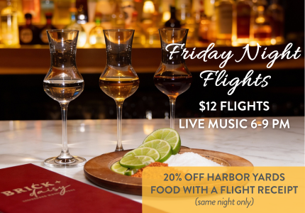 Join us every Friday from 6:00 p.m. – 9:00 p.m. in Harbor Yards at Brick & Daisy for Friday Night Flights, a rotating tasting experience featuring 3–5 curated spirits in each flight. Guests who purchase a beverage flight receive 20% off food the night of the event. No two Fridays are the same.